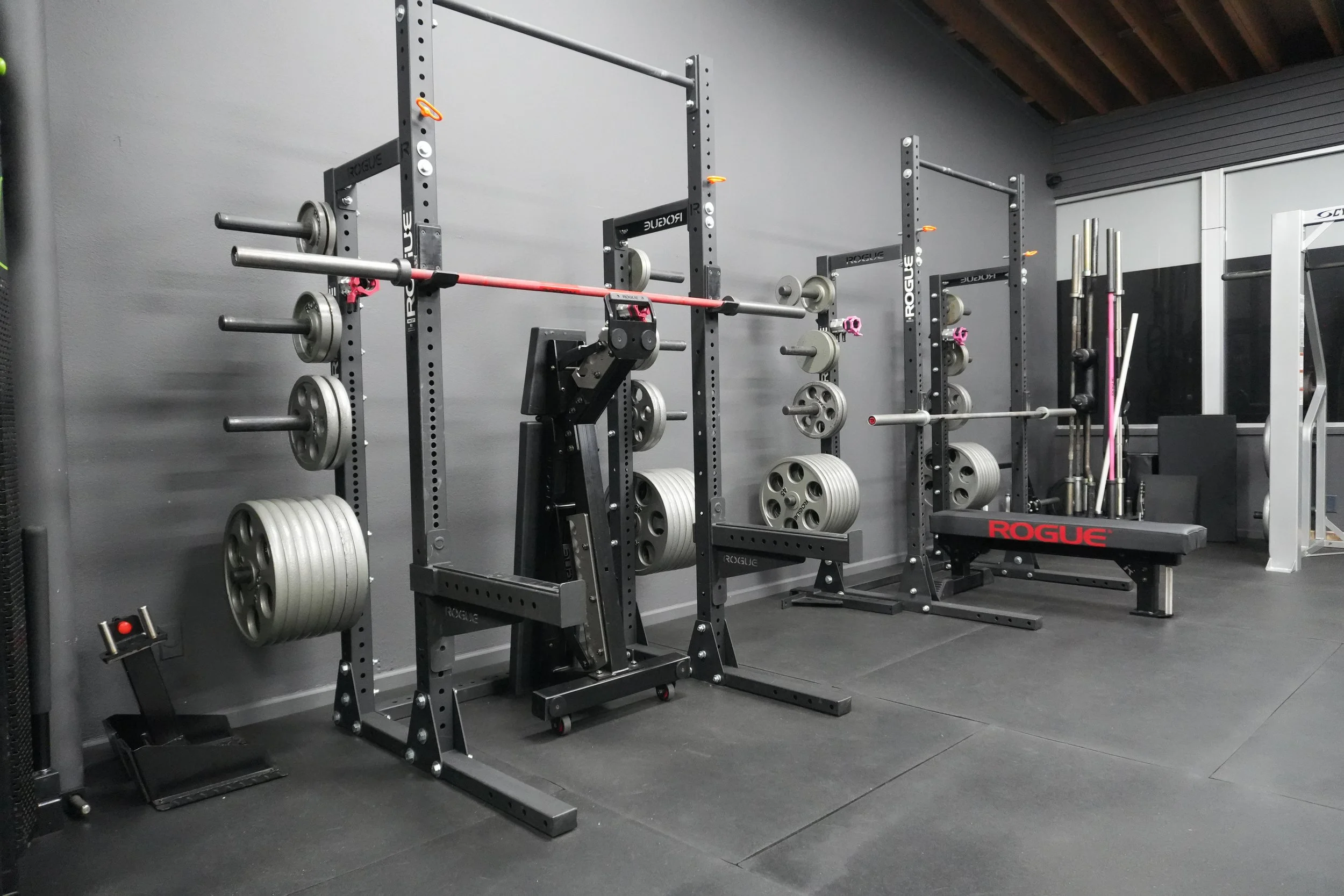 Two Rogue Half Racks | Cybex Smith Machine | Ivanko Dumbbells 5-150lbs | Various Specialty Bars | Weight It Out Steel & Cast Iron Custom Plates